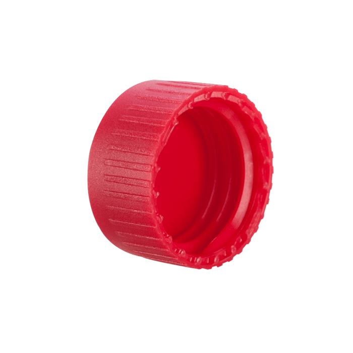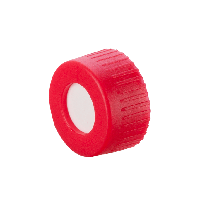 Caps, Screw Top, with Silicone Rubber / PTFE, low durometer Septa, bonded in "knurled", polypropylene, Red Caps. For use with 9-425mm thread, 12x32mm autosampler vials. MicroSolv Brand. 1000/CS.