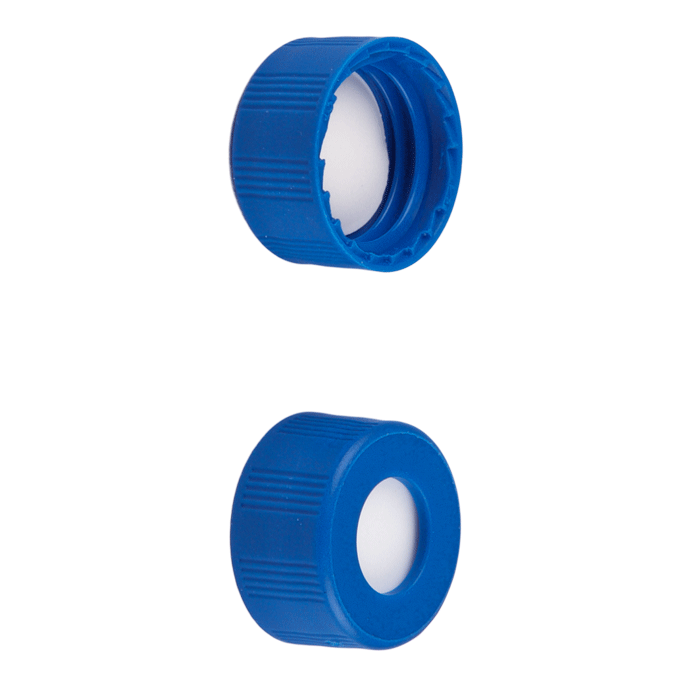 Caps, Screw Top, with White Silicone Rubber / White PTFE Septa, fitted in "knurled", polypropylene, Blue Caps. Recommended for Mass Spec. For use with 9-425mm thread, 12x32mm autosampler vials. Compares to Agilent caps. 100/PK.