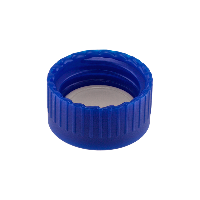 Caps, Screw Top, with Tan Silicone Rubber / White PTFE Septa, bonded in "knurled", polypropylene, Blue Caps. For use with 9-425mm thread, 12x32mm autosampler vials. AQ Brand. 1000/CS.