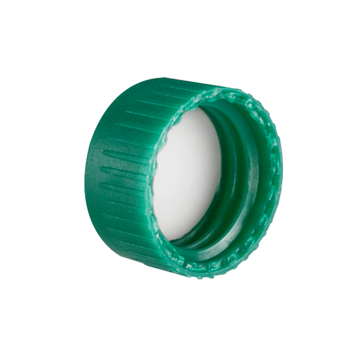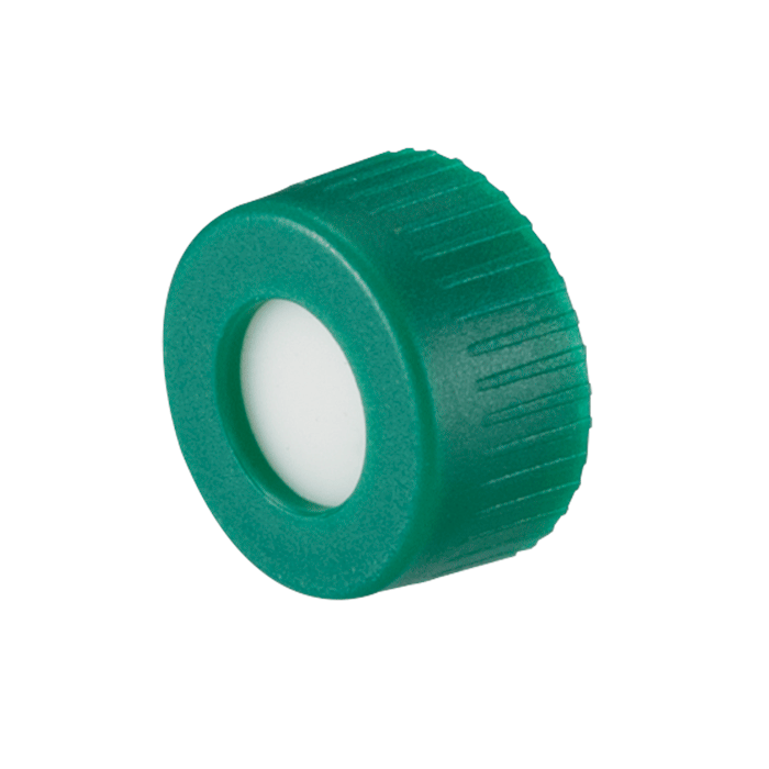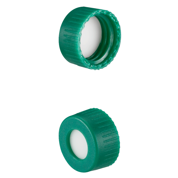 Caps, Screw Top, with Tan Silicone Rubber / White PTFE Septa, bonded in "knurled", polypropylene, Green Caps. For use with 9-425mm thread, 12x32mm autosampler vials. AQ Brand. 100/PK.