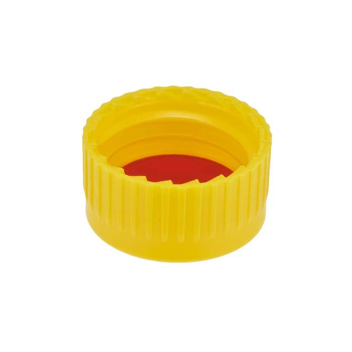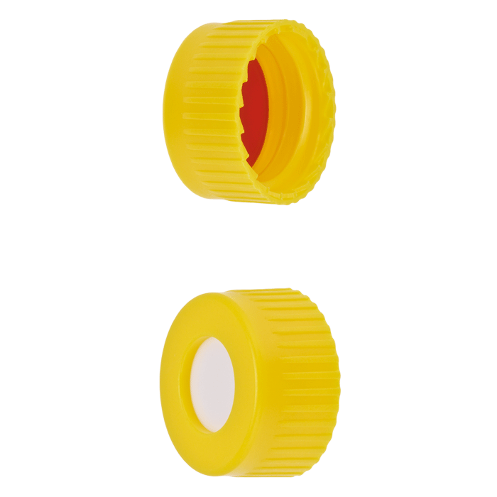 Caps, Screw Top, with Silicone Rubber / PTFE, low durometer Septa, bonded in "knurled", polypropylene, Yellow Caps. For use with 9-425 thread, 12x32mm autosampler vials. MicroSolv Brand. 100/PK.