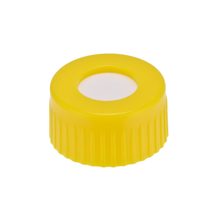 Caps, Screw Top, with Silicone Rubber / PTFE, low durometer Septa, bonded in "knurled", polypropylene, Yellow Caps. For use with 9-425 thread, 12x32mm autosampler vials. MicroSolv Brand. 1000/CS.