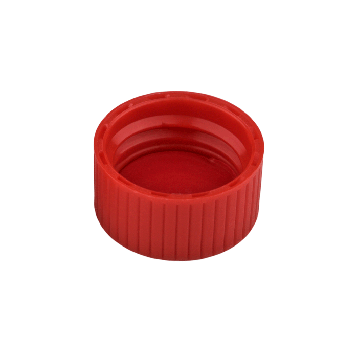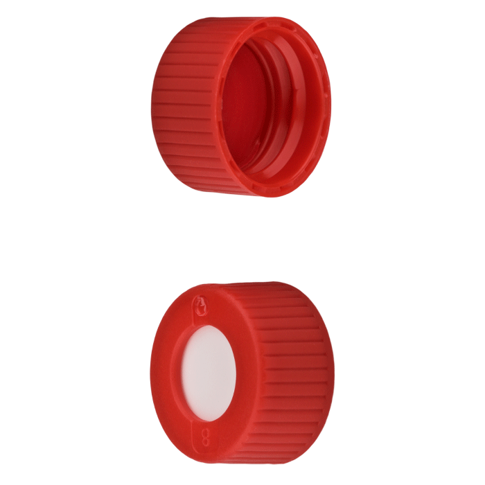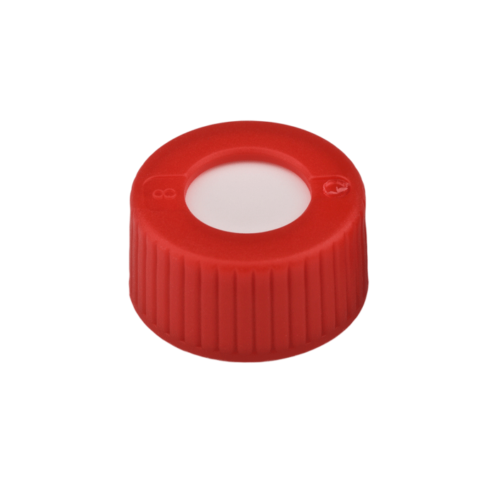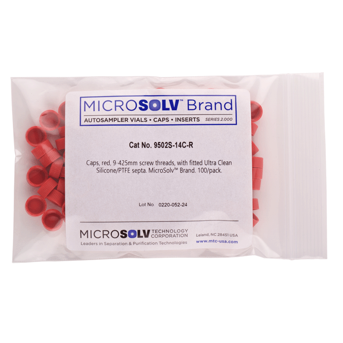 Caps, Screw Top, with ultra-clean Silicone Rubber / PTFE Septa, fitted in "knurled", polypropylene, Red Caps. For use with 9-425mm thread, 12x32mm autosampler vials. MicroSolv Brand. 100/PK