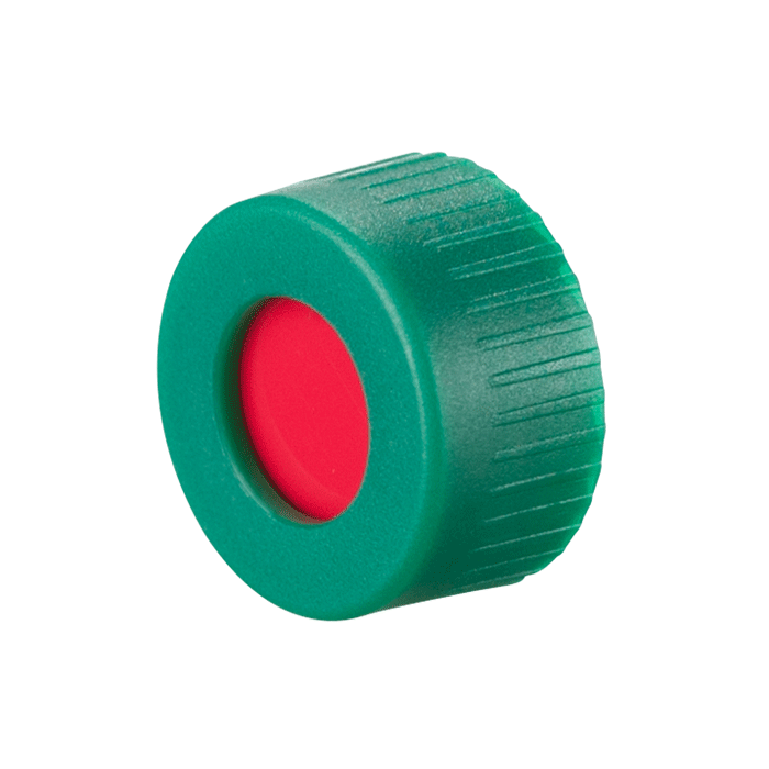 Caps, Screw Top, with Red PTFE / White Silicone Rubber / Red PTFE Septa, fitted in "knurled", polypropylene, Green Caps. For use with 9-425mm thread, 12x32mm autosampler vials. MicroSolv Brand. 100/PK