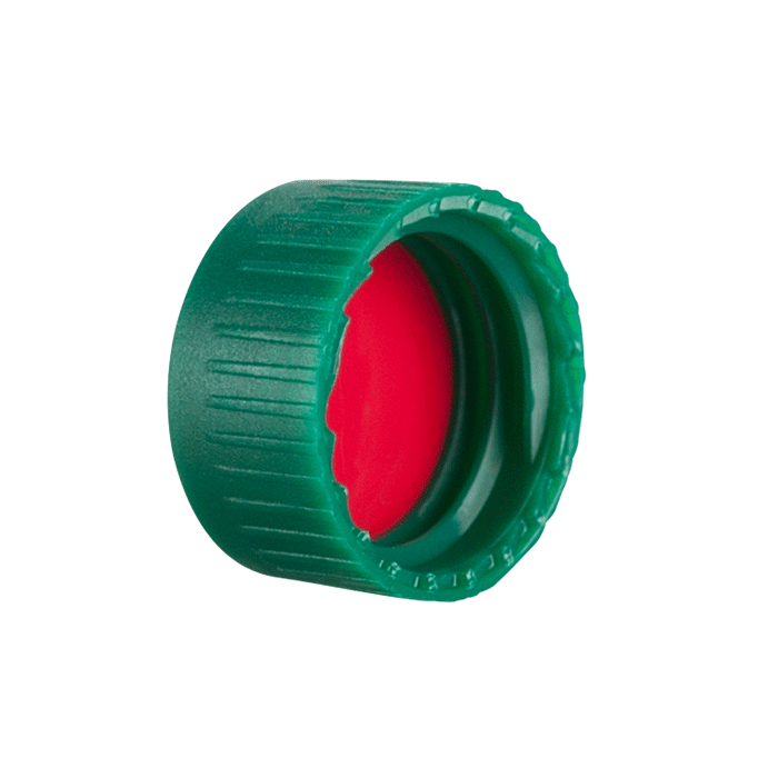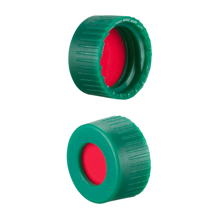 Caps, Screw Top, with Red PTFE / White Silicone Rubber / Red PTFE Septa, fitted in "knurled", polypropylene, Green Caps. For use with 9-425mm thread, 12x32mm autosampler vials. MicroSolv Brand. 1000/CS