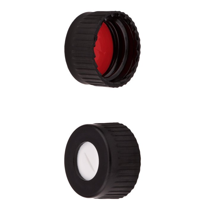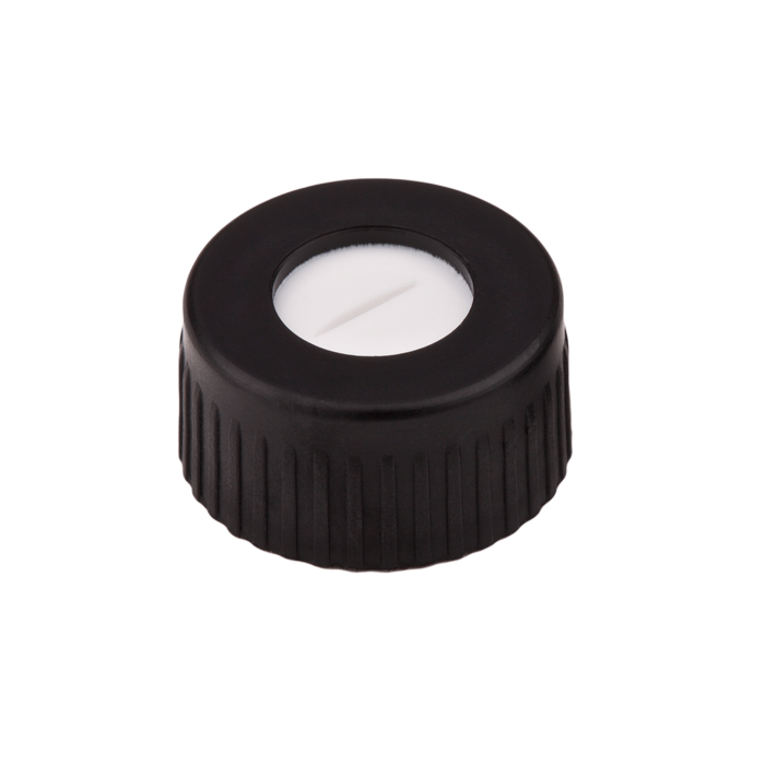 Caps, Screw Top, with Silicone Rubber / PTFE Pre-Slit Septa, bonded in "knurled", polypropylene, Black Caps. For use with 9-425mm thread, 12x32mm autosampler vials. MicroSolv Brand. 1000/CS