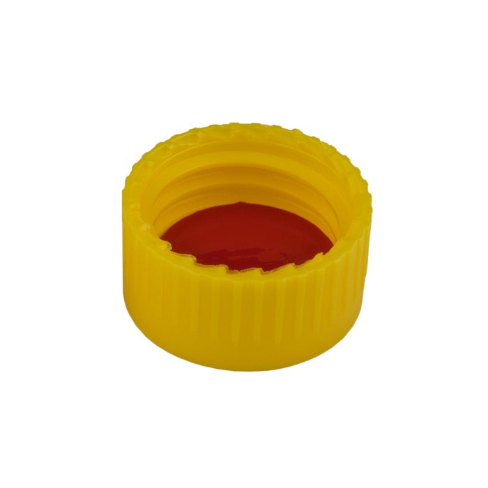 Caps, Screw Top, with Silicone Rubber / PTFE Pre-Slit Septa, bonded in "knurled", polypropylene, Yellow Caps. For use with 9-425mm thread, 12x32mm autosampler vials. MicroSolv Brand. 100/PK