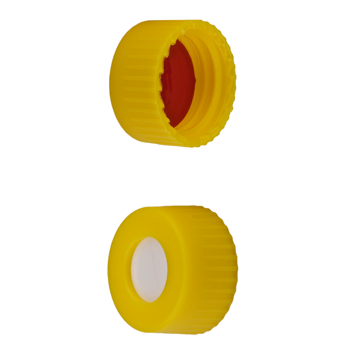 Caps, Screw Top, with Silicone Rubber / PTFE Pre-Slit Septa, bonded in "knurled", polypropylene, Yellow Caps. For use with 9-425mm thread, 12x32mm autosampler vials. MicroSolv Brand. 1000/CS