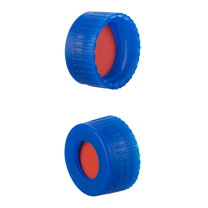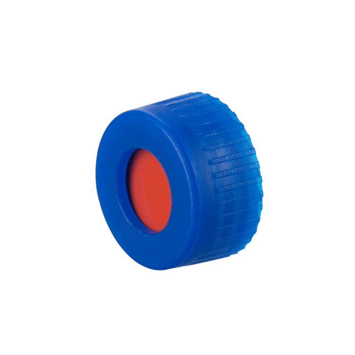 Caps, Screw Top, with Orange Red Rubber / PTFE Septa, bonded in "knurled", polypropylene, Blue Caps. For use with 9-425mm thread, 12x32mm autosampler vials. MicroSolv Brand. 100/PK.