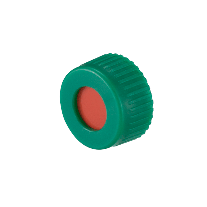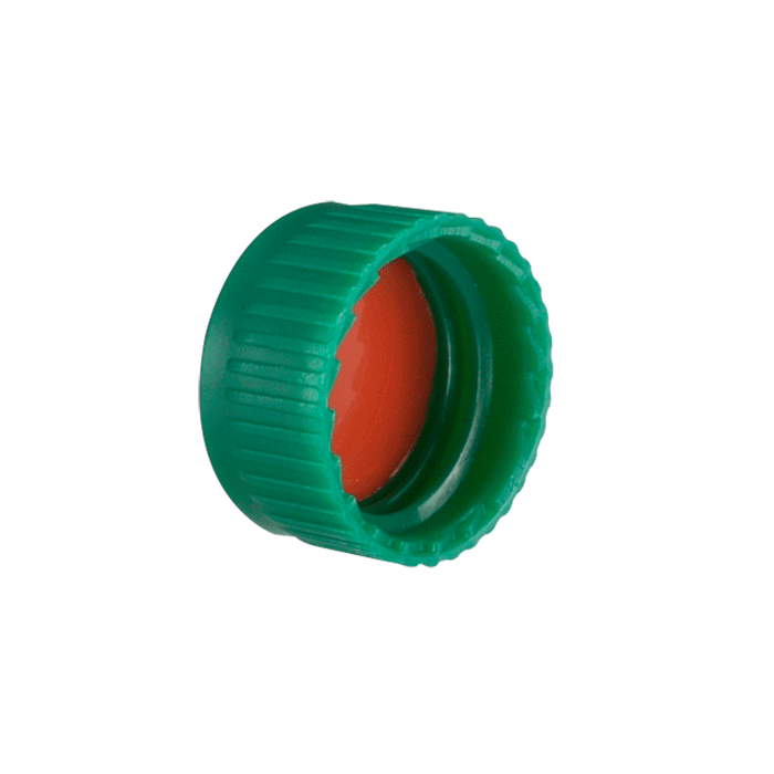 Caps, Screw Top, with Orange Red Rubber / PTFE Septa, bonded in "knurled", polypropylene, Green Caps. For use with 9-425mm thread, 12x32mm autosampler vials. MicroSolv Brand. 1000/CS.