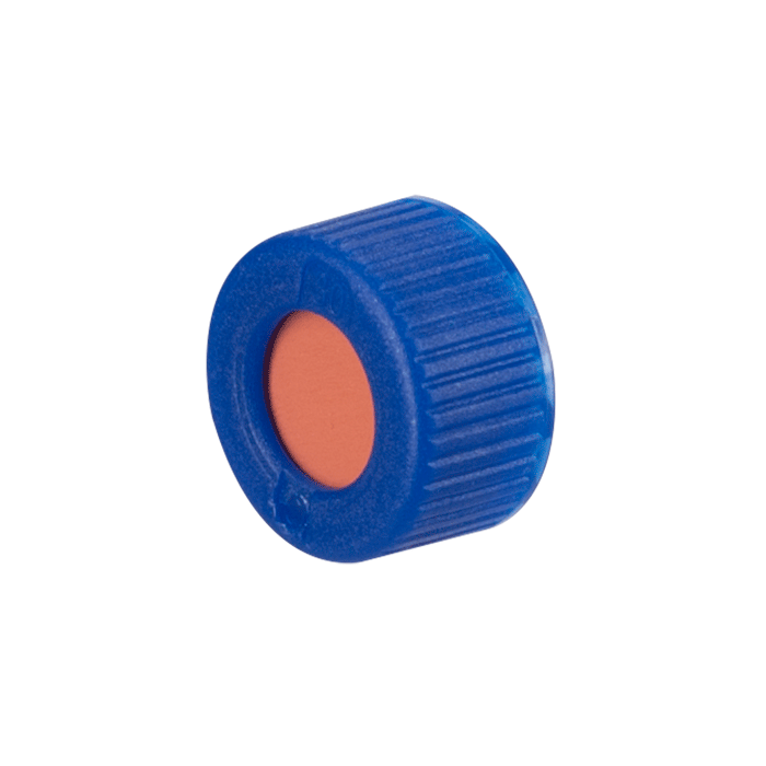 Caps, Screw Top, with Natural Rubber / TFE Septa, fitted in "knurled", polypropylene, Blue Caps. For use with 9-425mm thread, 12x32mm autosampler vials. MicroSolv Brand. 1000/CS.