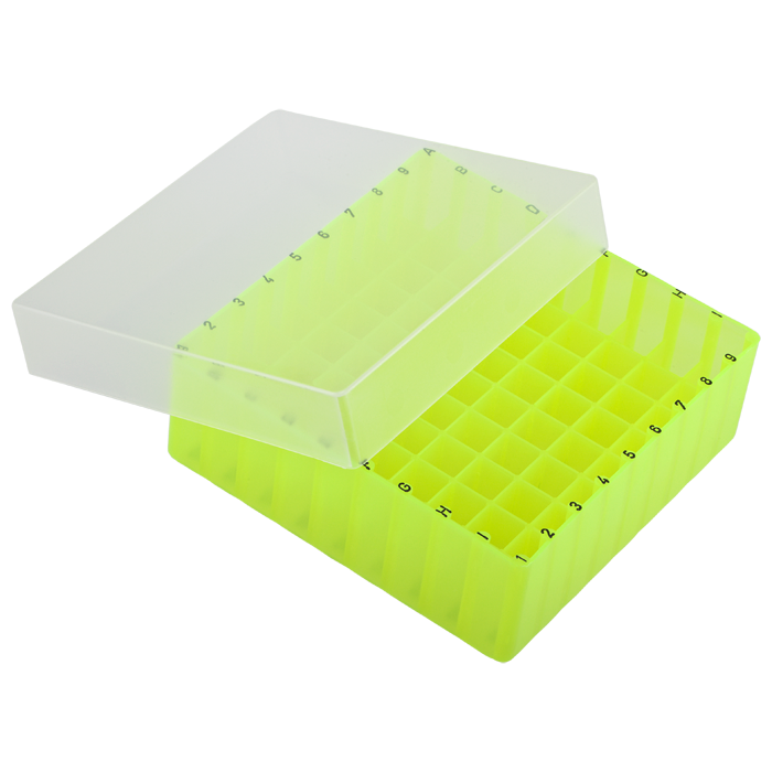 Storage Box for 2ml Autosampler Vials. Yellow, chemical resistant polypropylene holds 81 vials. Complete with translucent plastic lid. 1 EA.