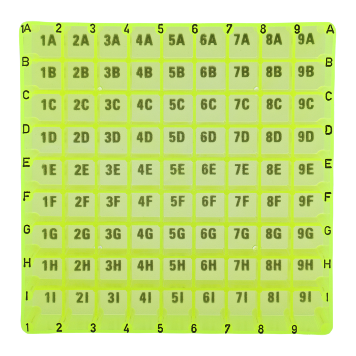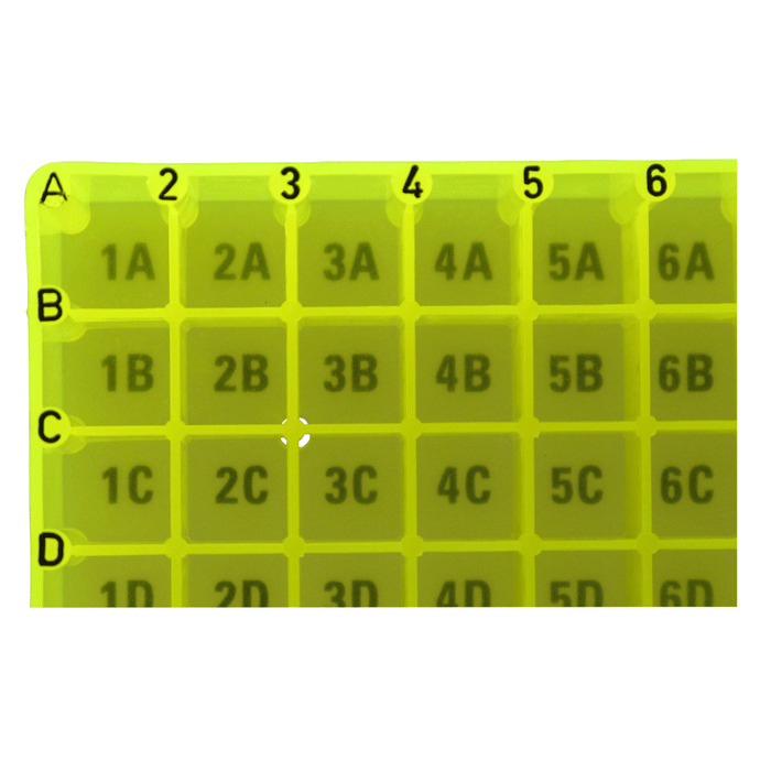 Alpha numeric indexing coded on bottom of wells and along the sides of the box for clear sample identification.