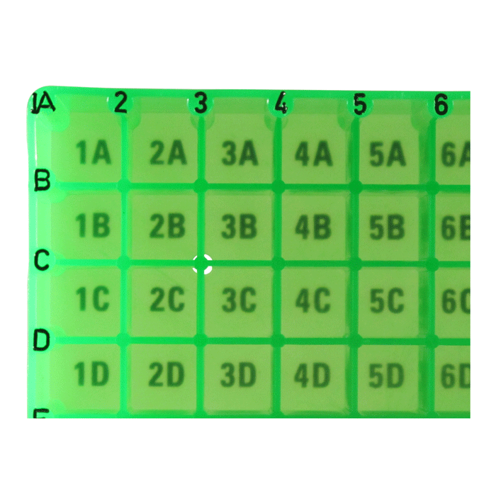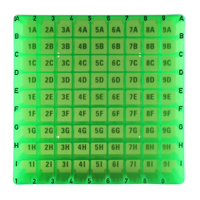 Alpha numeric indexing coded on bottom of wells and along the sides of the box for clear sample identification.