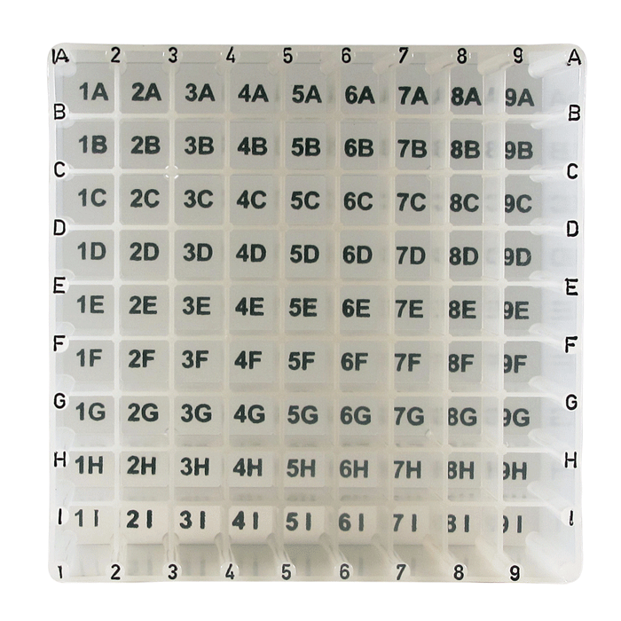 Alpha numeric indexing coded on bottom of wells and along the sides of the box for clear sample identification.