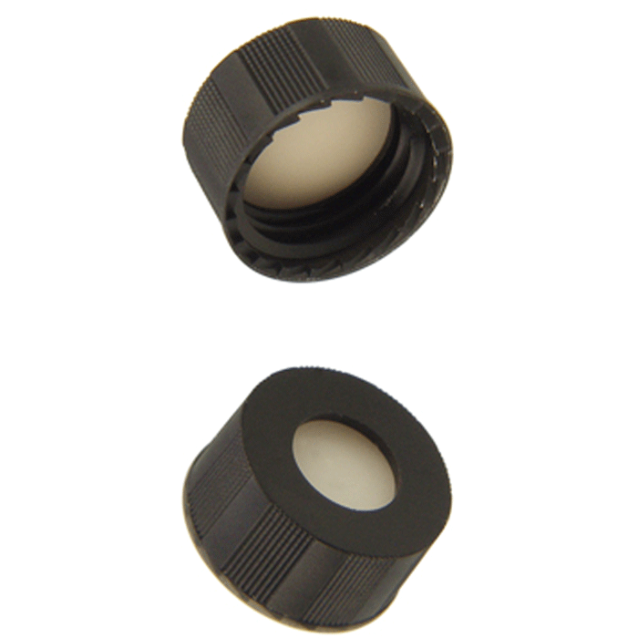 Caps, Screw Top, with White Silicone Rubber / Natural PTFE Septa, fitted in "knurled", polypropylene, Black Caps. For use with 9-425mm thread, 12x32mm autosampler vials. BASIK Brand. 100/PK.