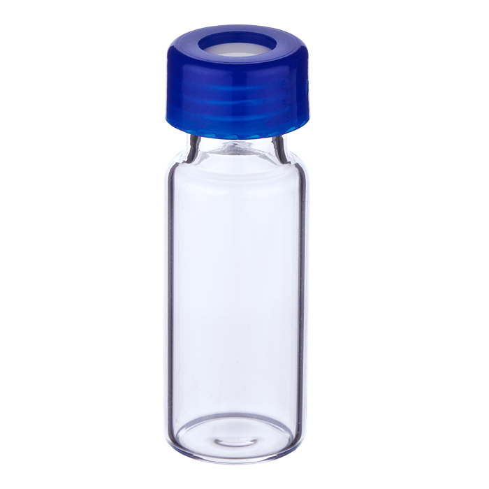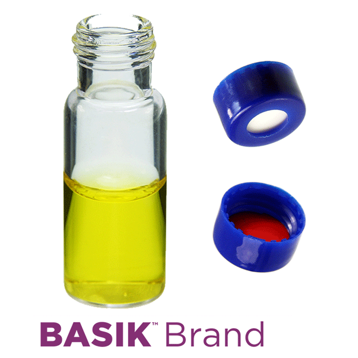 Vial & Cap Kit Includes 100 EA 2ml, Screw Top, Clear Autosampler Vials and 100 EA matching Screw Caps with Silicone Rubber / PTFE Septa, fitted in the Robo Style, Blue Caps. Vials and Caps are Pre-assembled. BASIK Brand Easy Purchase Pack. 1/PK.