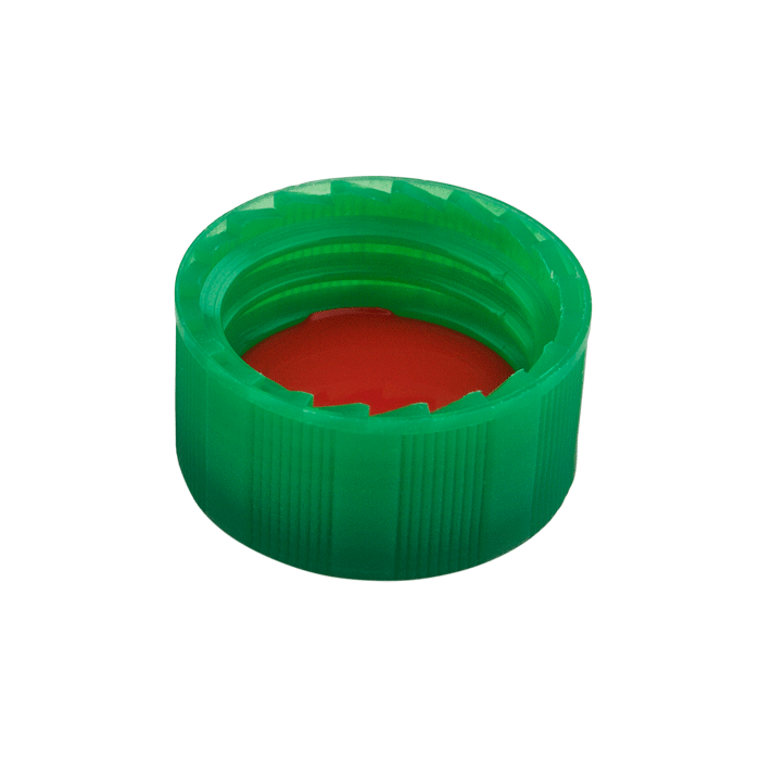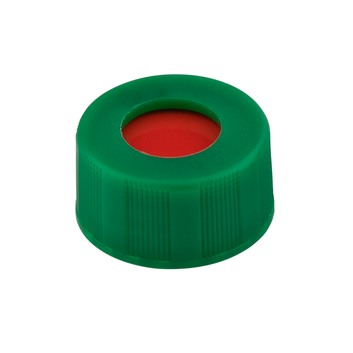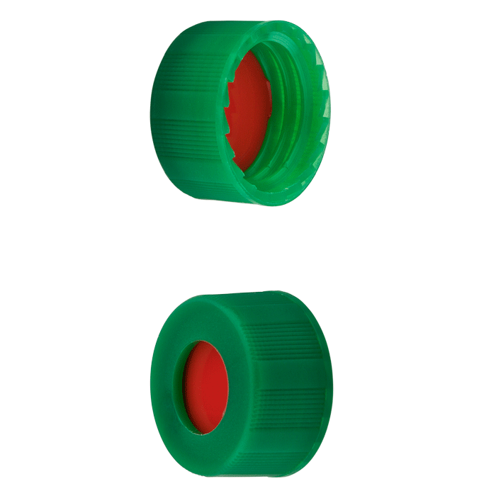 Caps, Screw Top, with PTFE / Silicone Rubber / PTFE Septa, fitted in "knurled", polypropylene, Green Caps. For use with 9-425mm thread, 12x32mm autosampler vials. BASIK Brand. 100/PK.