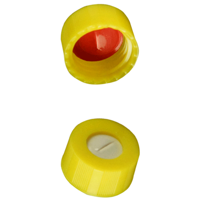Caps, Screw Top, with Soft-Guard, White Silicone Rubber / Red PTFE Pre-Slit Septa, bonded in "knurled", polypropylene, Yellow Caps. For use with 9-425mm thread, 12x32mm autosampler vials. Soft-Guard Brand. 100/PK