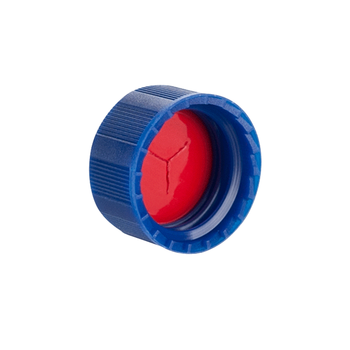 Caps, Screw Top, with Soft-Guard, White Silicone Rubber / Red PTFE Pre-Slit (Y Shape) Septa, fitted in "knurled", polypropylene, Blue Caps. For use with 9-425mm thread, 12x32mm autosampler vials. Soft-Guard Brand. 100/PK
