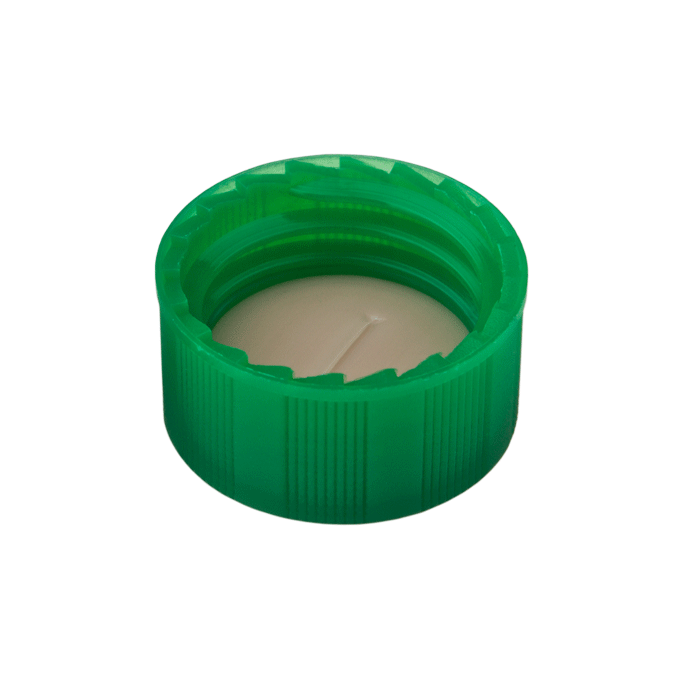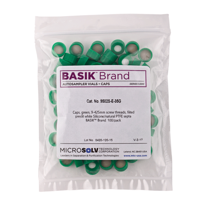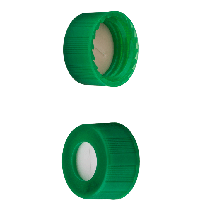 Caps, Screw Top, with White Silicone Rubber / Natural PTFE Pre-Slit Septa, fitted in "knurled", polypropylene, Green Caps. For use with 9-425mm thread, 12x32mm autosampler vials. BASIK Brand. 100/PK.