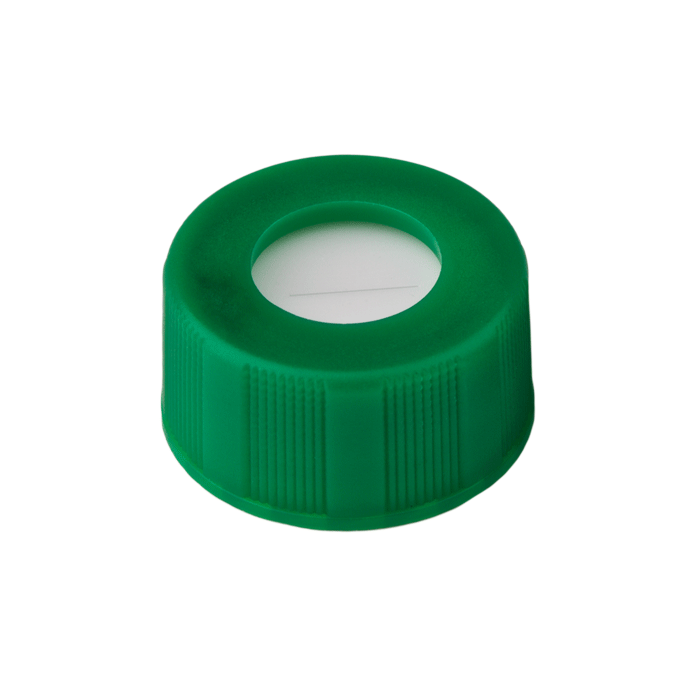 Caps, Screw Top, with White Silicone Rubber / Natural PTFE Pre-Slit Septa, fitted in "knurled", polypropylene, Green Caps. For use with 9-425mm thread, 12x32mm autosampler vials. BASIK Brand. 1000/CS.
