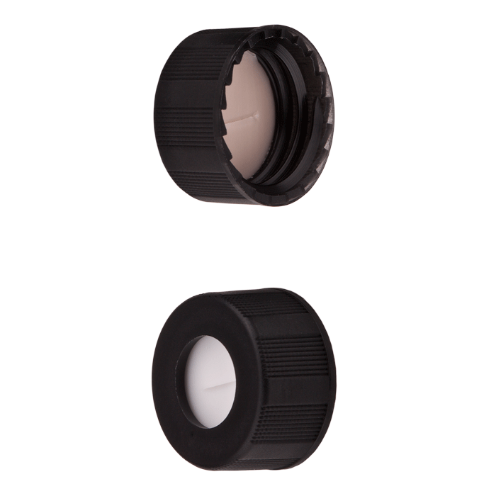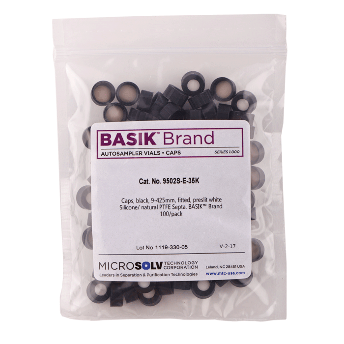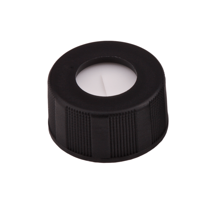 Caps, Screw Top, with White Silicone Rubber / Natural PTFE Pre-Slit Septa, fitted in "knurled", polypropylene, Black Caps. For use with 9-425mm thread, 12x32mm autosampler vials. BASIK Brand. 100/PK.