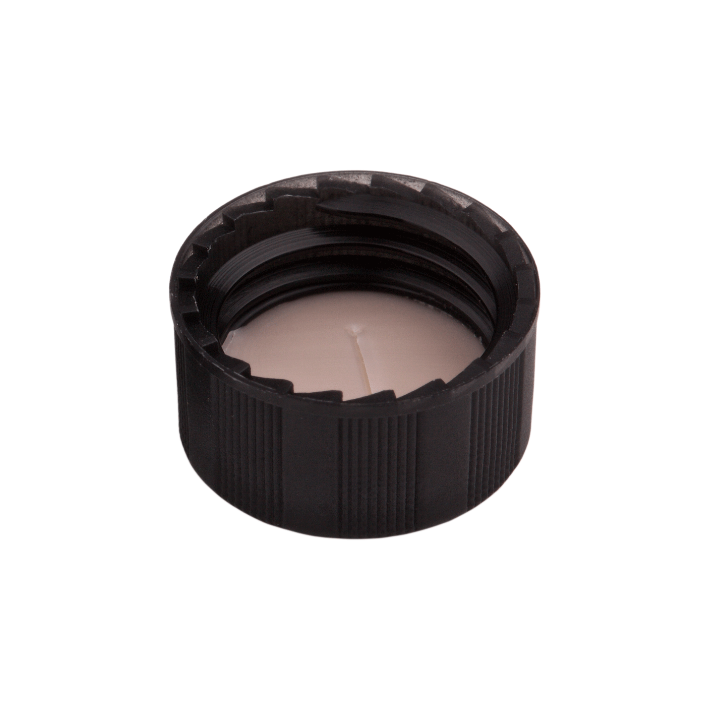 Caps, Screw Top, with White Silicone Rubber / Natural PTFE Pre-Slit Septa, fitted in "knurled", polypropylene, Black Caps. For use with 9-425mm thread, 12x32mm autosampler vials. BASIK Brand. 1000/CS.
