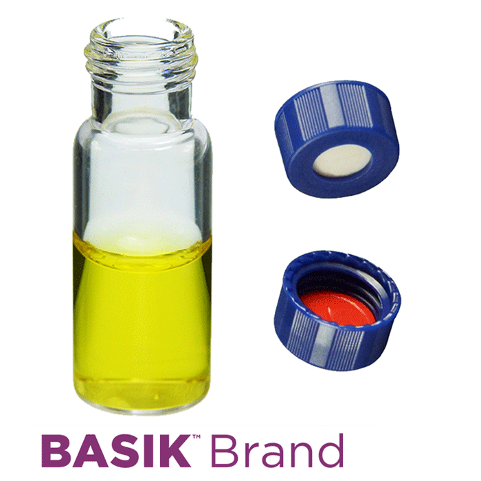 Vial & Cap Kit Includes 100 EA 2ml, Screw Top, Clear Autosampler Vials and 100 EA matching Screw Caps with White Silicone Rubber / Red PTFE Pre-Slit, Soft-Guard Septa, bonded in the Blue Caps. BASIK Brand Easy Purchase Pack. 1/PK.