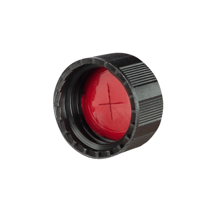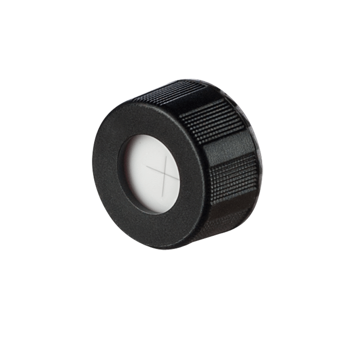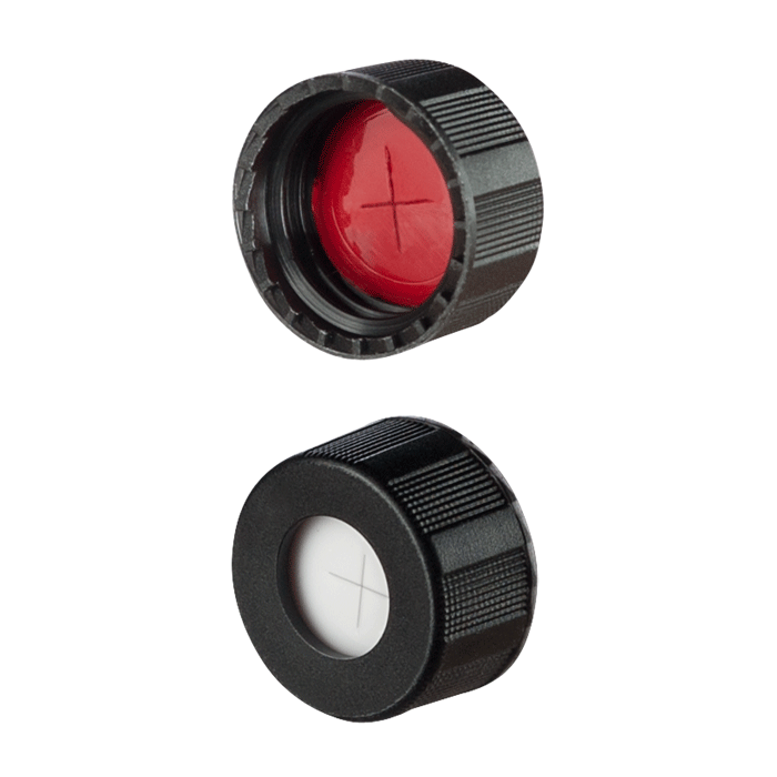 Caps, Screw Top, with Soft-Guard, White Silicone Rubber / Red PTFE Pre-Slit (X Shape) Septa, fitted in "knurled", polypropylene, Black Caps. For use with 9-425mm thread, 12x32mm autosampler vials. Soft-Guard Brand. 100/PK
