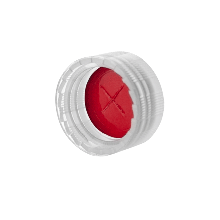 Caps, Screw Top, with Soft-Guard, White Silicone Rubber / Red PTFE Pre-Slit (X Shape) Septa, fitted in "knurled", polypropylene, Natural Caps. For use with 9-425mm thread, 12x32mm autosampler vials. Soft-Guard Brand. 100/PK