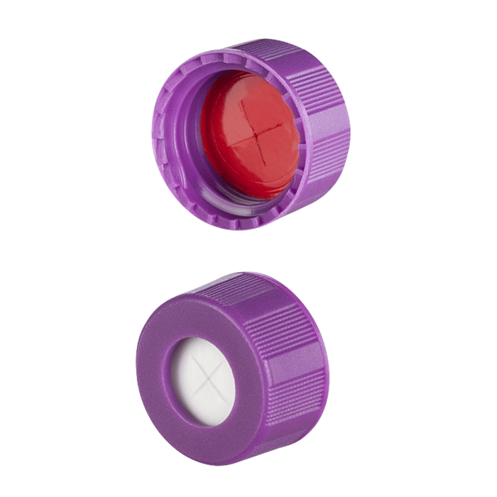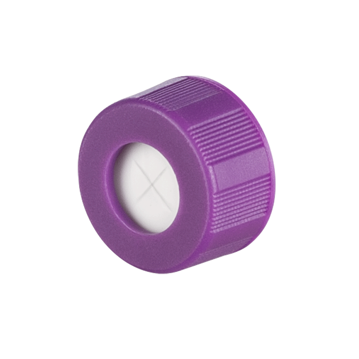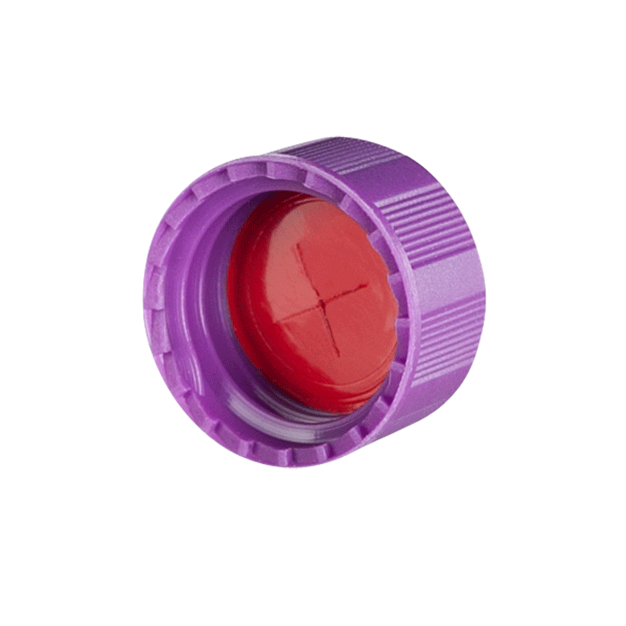 Caps, Screw Top, with Soft-Guard, White Silicone Rubber / Red PTFE Pre-Slit (X Shape) Septa, fitted in "knurled", polypropylene, Purple Caps. For use with 9-425mm thread, 12x32mm autosampler vials. Soft-Guard Brand. 100/PK