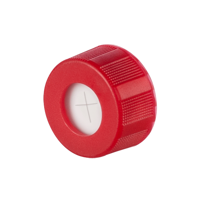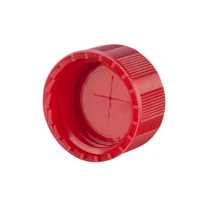 Caps, Screw Top, with Soft-Guard, White Silicone Rubber / Red PTFE Pre-Slit (X Shape) Septa, fitted in "knurled", polypropylene, Red Caps. For use with 9-425mm thread, 12x32mm autosampler vials. Soft-Guard Brand. 100/PK