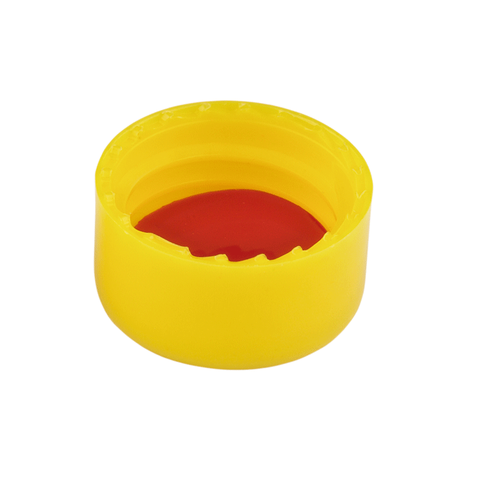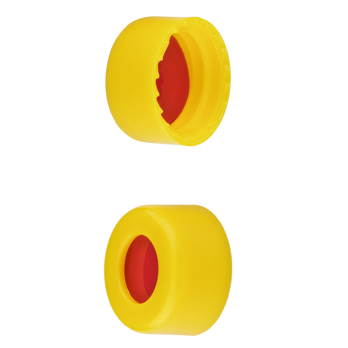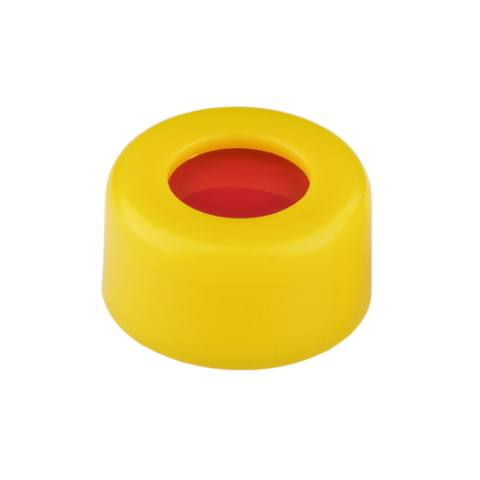 Caps, Screw Top, with Red PTFE / White Silicone Rubber / Red PTFE Septa, fitted in smooth sided, Robo Style, soft polypropylene, Yellow Caps. For use with 9-425mm thread, 12x32mm autosampler vials. MicroSolv Brand. 100/PK.
