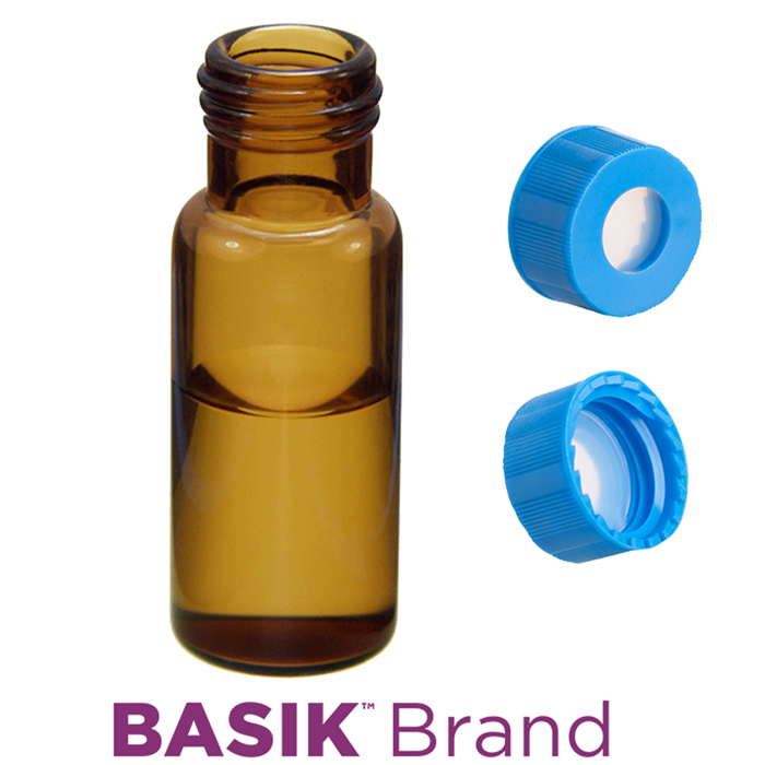 Vial & Cap Kit Includes 100 EA 2ml, Screw Top, Amber Autosampler Vials and 100 EA matching Screw Caps with Silicone Rubber / PTFE, ultra-pure Septa, fitted in the Light Blue Caps. BASIK Brand Easy Purchase Pack. 1/PK.