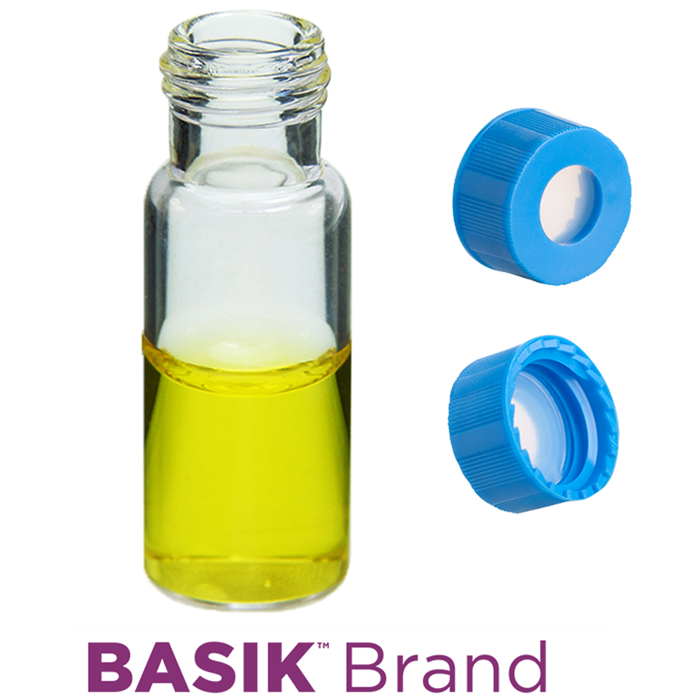 Vial & Cap Kit Includes 100 EA 2ml, Screw Top, Clear Autosampler Vials and 100 EA matching Screw Caps with Silicone Rubber / PTFE, ultra-pure Septa, fitted in the Light Blue Caps. BASIK Brand Easy Purchase Pack. 1/PK.