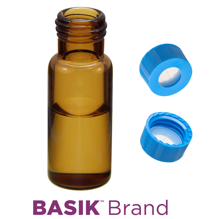 Vial & Cap Kit Includes 100 EA 2ml, Screw Top, Amber Autosampler Vials and 100 EA matching Screw Caps with Silicone Rubber / PTFE, ultra-pure Pre-Slit Septa, fitted in the Light Blue Caps. BASIK Brand Easy Purchase Pack. 1/PK.