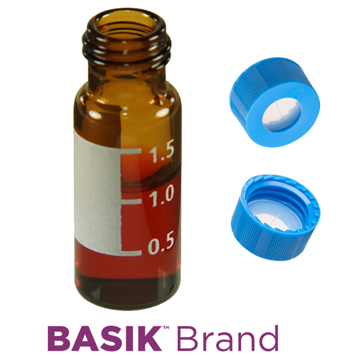 Vial & Cap Kit Includes 100 EA 2ml, Screw Top, Amber Autosampler Vials with Write-On Patch and fill lines and 100 EA matching Screw Caps with Silicone Rubber / PTFE, ultra-pure Pre-Slit Septa, fitted in the Light Blue Caps. BASIK Brand Easy Purchase Pack. 1/PK.