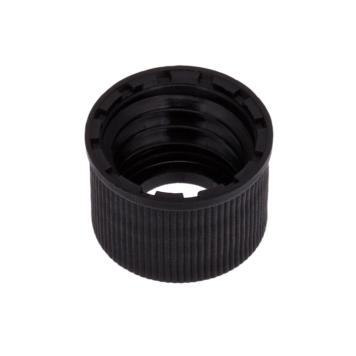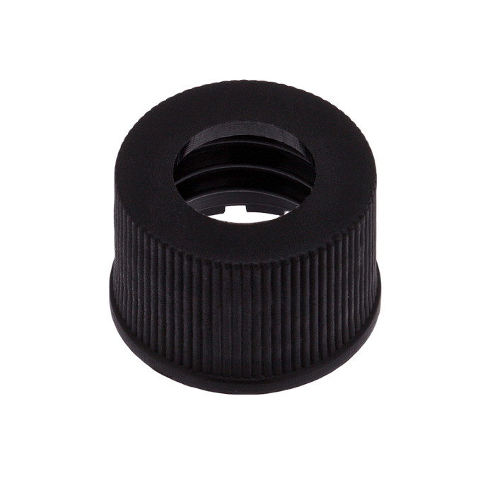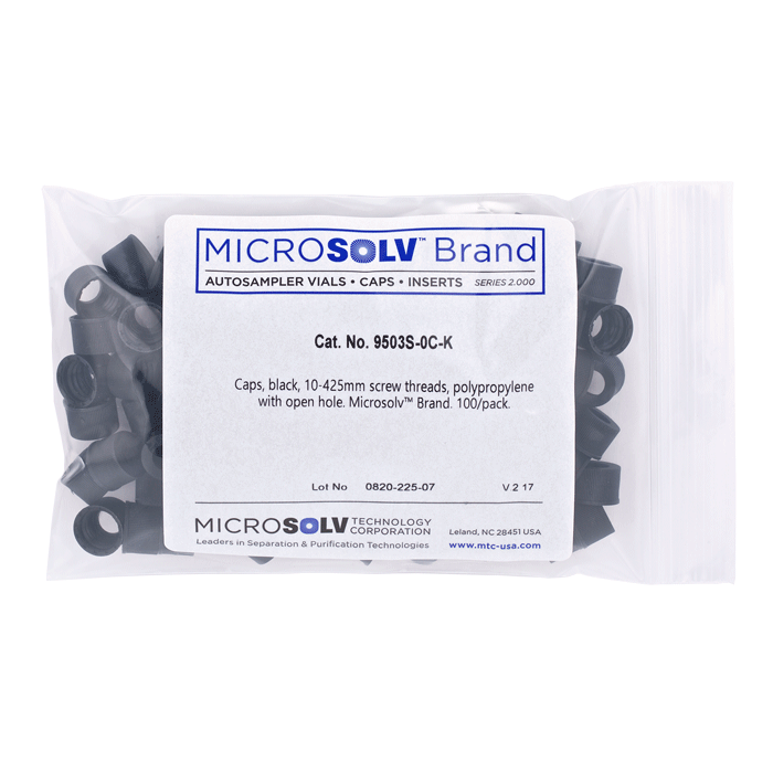 Caps, Screw Top, with an Open Hole. "Knurled", polypropylene, Black Caps. Septa are sold separately and must be inserted manually. For use with 10-425mm thread, 12x32mm autosampler vials. MicroSolv Brand. 100/PK.