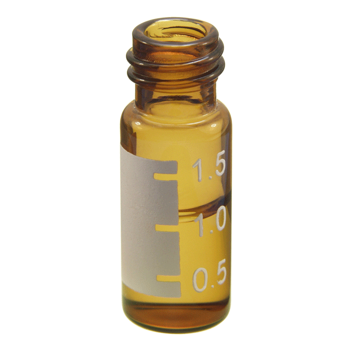 Vials, Screw Top, Glass. Amber, 2ml, with Write-On Patch and graduations, 10-425mm threads, 12x32mm outer dimensions. For use as an autosampler vial. BASIK Brand. 100/PK.