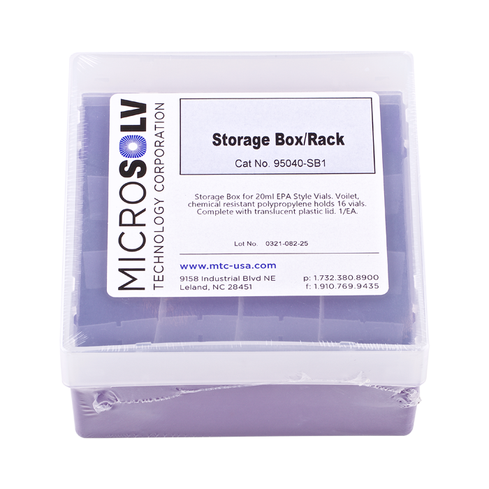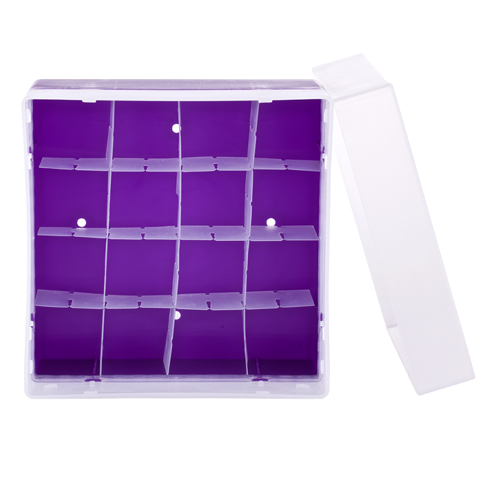 Storage Box for 20ml EPA Style Vials. Violet, chemical resistant polypropylene holds 16 vials. Complete with translucent plastic lid. 1 EA.
