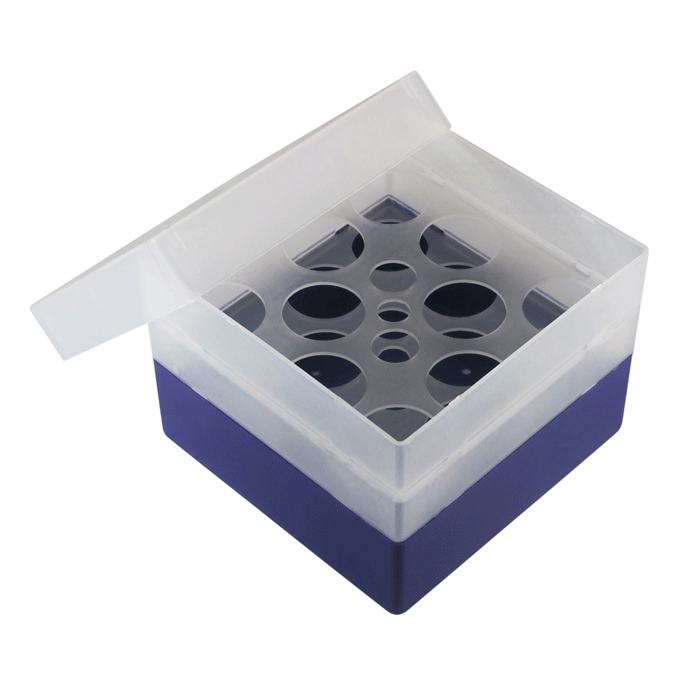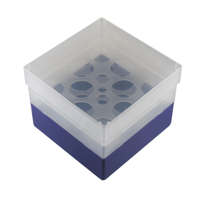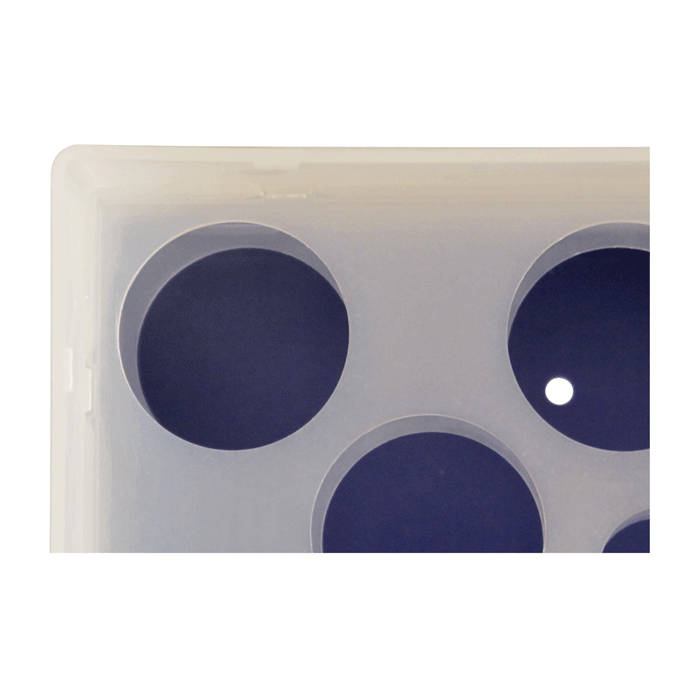 Storage Box for 30 or 40ml EPA Style Vials. Blue, chemical resistant polypropylene holds 10 vials. Complete with translucent plastic lid. 1 EA.