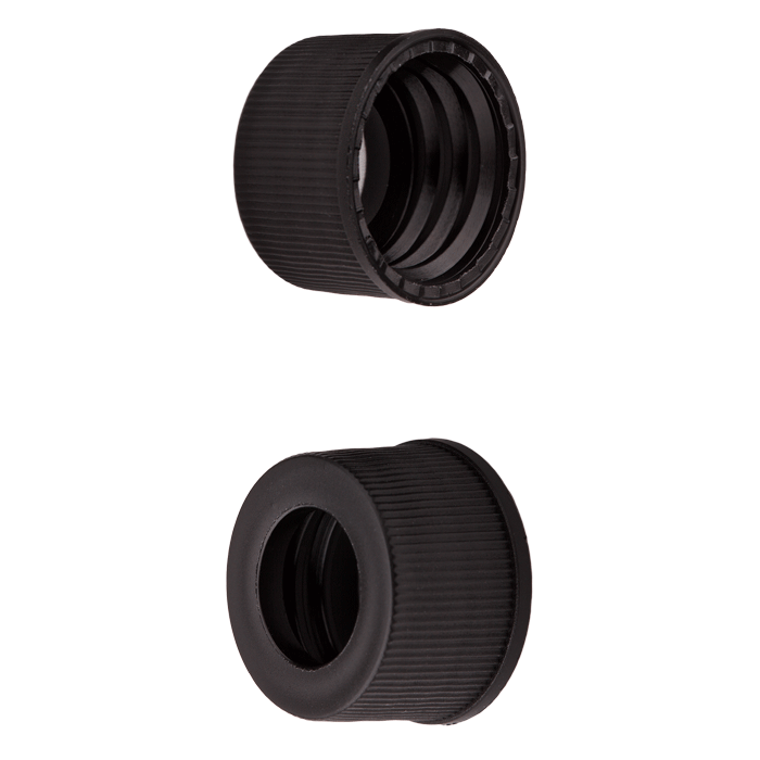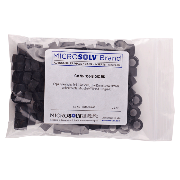 Caps, Screw Top, with an Open Hole, "knurled", polypropylene, Black Caps. Septa are sold separately and must be inserted manually. For use with 13-425mm thread, 15x45mm autosampler vials. MicroSolv Brand. 100/PK.