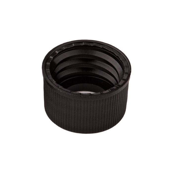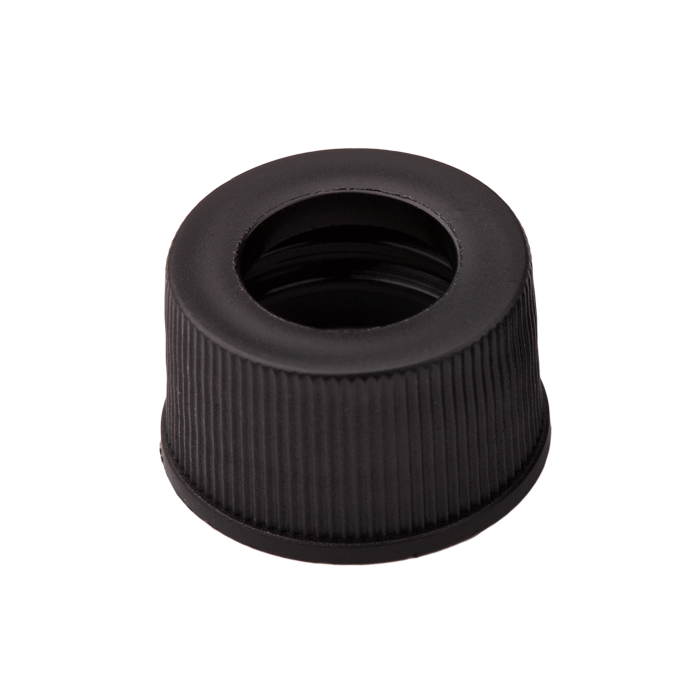 Caps, Screw Top, with an Open Hole. "knurled", polypropylene, Black Caps. Septa are sold separately and must be inserted manually. For use with 13-425mm thread, 15x45mm autosampler vials. MicroSolv Brand. 1000/CS.