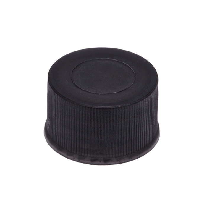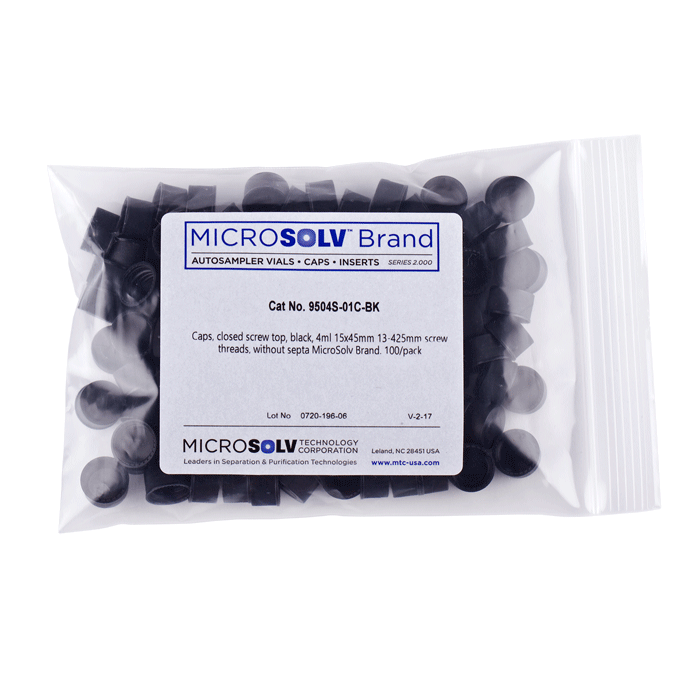 Caps, Screw Top, Solid, without a liner. "knurled", polypropylene, Black Caps. For use with 13-425mm thread, 15x45mm autosampler vials. MicroSolv Brand 100/PK.