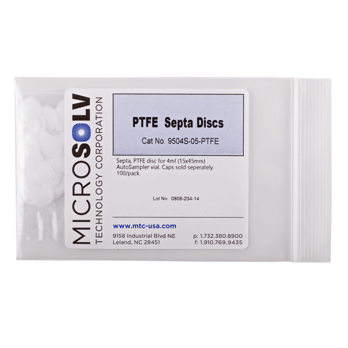 Septa, 13mm, PTFE Disc for use in 13-425mm thread, 15x45mm autosampler vial caps. Caps sold separately. MicroSolv Brand. 100/PK