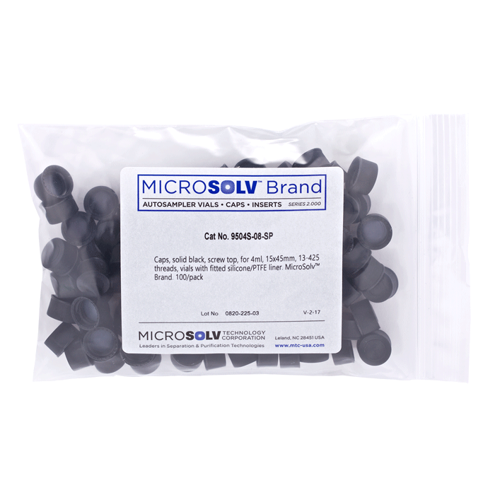 Caps, Screw Top, Solid, with a Red Butyl Rubber/ Grey PTFE liner, in "knurled", polypropylene, Black Caps. For use with 13-425mm thread,15x45mm autosampler vials. MicroSolv Brand. 100/PK.