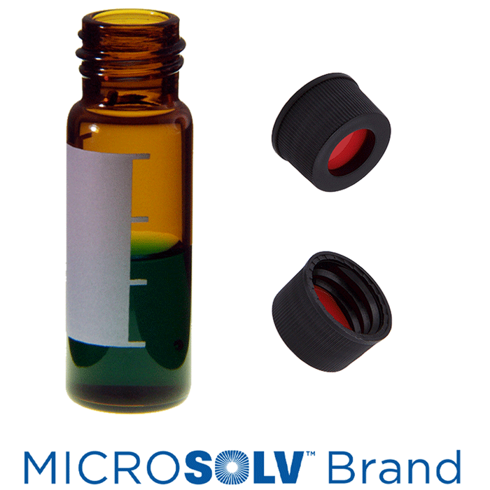 Vial & Cap Kit Includes 100 EA 4ml, Screw Top, Amber Autosampler Vials with Write-On Patch and fill lines and 100 EA matching Screw Caps with Red PTFE / White Silicone Rubber / Red PTFE Septa, fitted in the Black Caps, MicroSolv Brand Easy Purchase Pack. 1/PK.