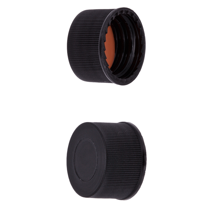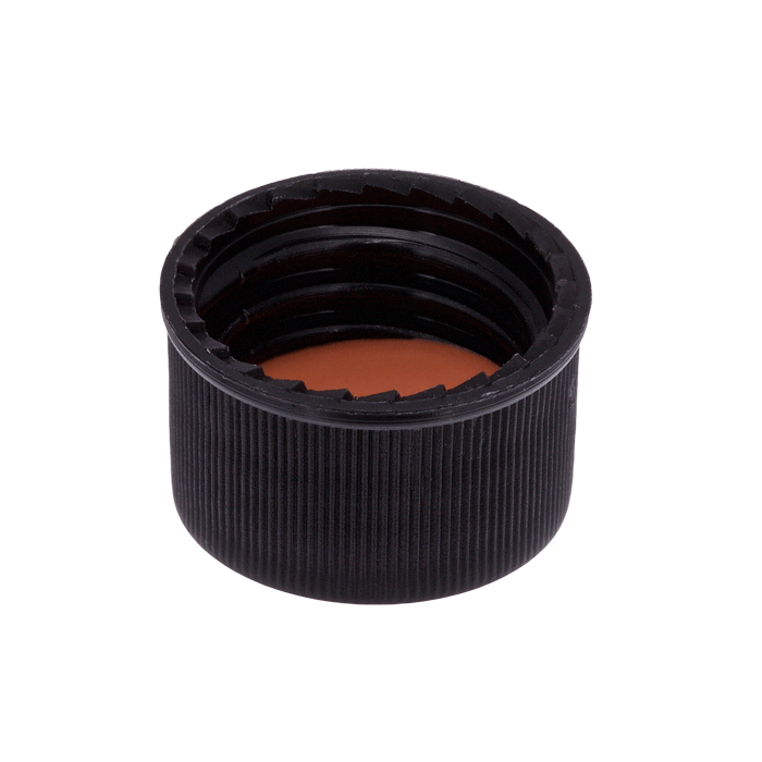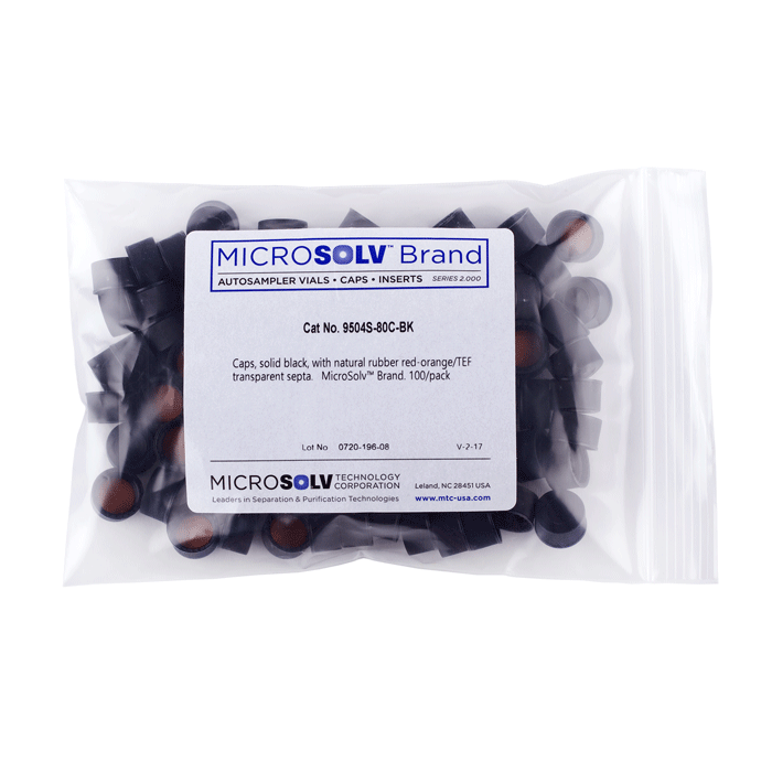 Caps, Screw Top, Solid, with a Red Orange Natural Rubber/ Transparent TFE liner, in "knurled", polypropylene, Black Caps. For use with 13-425mm thread,15x45mm autosampler vials. MicroSolv Brand. 100/PK.
