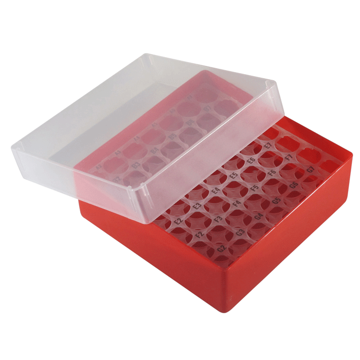 Storage Box for 4ml Autosampler Vials. Red, chemical resistant polypropylene holds 49 vials. Complete with translucent plastic lid. 1 EA.